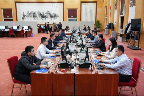 2025年3月9日,十四届全国人大三次会议秘书处工作人员在认真工作。新华社记者 郑焕松 摄