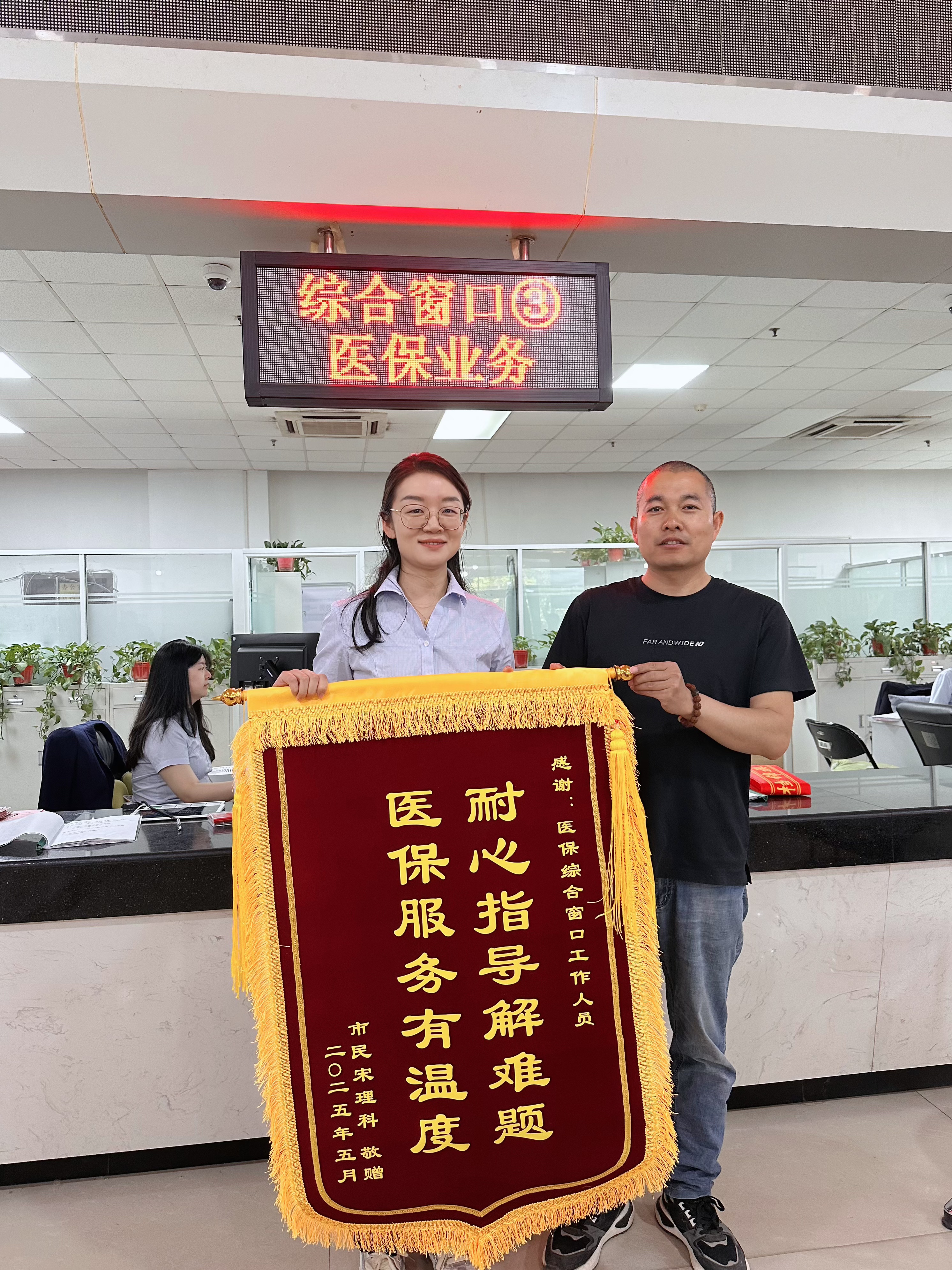 当宋先生得知参保办理成功的消息时,激动地说道:“太感谢你们了!要不是你们这么用心帮忙,我真不知道该怎么办。国家就需要像你们这样真心为群众着想、替群众排忧解难的好工作人员!”这份高效专业、贴心细致的服务,让宋先生深受感动。为了表达这份感激,他特意制作了这面锦旗,送到了医保窗口。