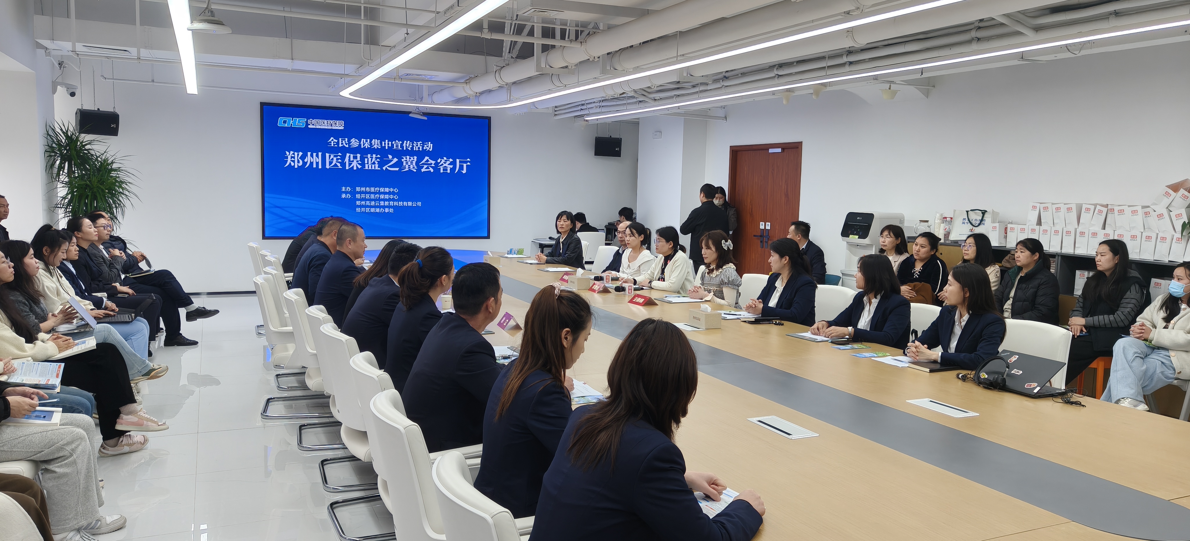 为深入贯彻国家及省、市关于基本医疗保险参保工作的部署要求,积极响应郑州市医疗保障中心“全民参保宣传月”活动号召,切实提升辖区内企业职工对医保政策的知晓率与覆盖面,营造“人人参保、人人受益”的良好氛围,2025年10月30日下午,经开区医保中心联合郑州市医保中心在郑州市经济技术开发区高途科教园开展“郑州医保‘蓝之翼会客厅’——全民参保集中宣传”活动。