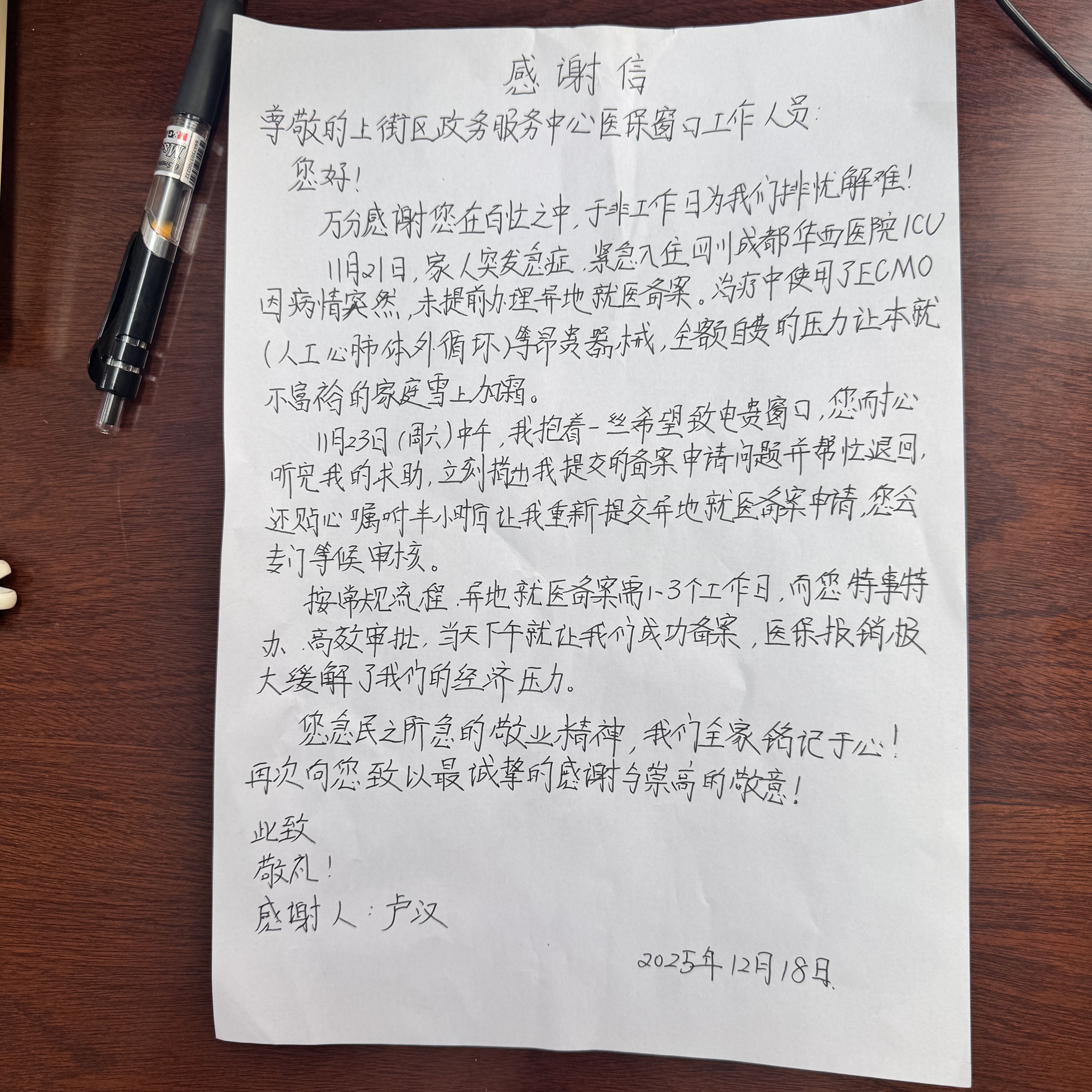 “你们如此为我们着想,我们全家铭记于心!”卢汉在感谢信中如是写道。此次暖心服务,不仅解决了群众的实际困难,更彰显了上街区政务服务中心医保窗口工作人员为民服务的初心与担当。